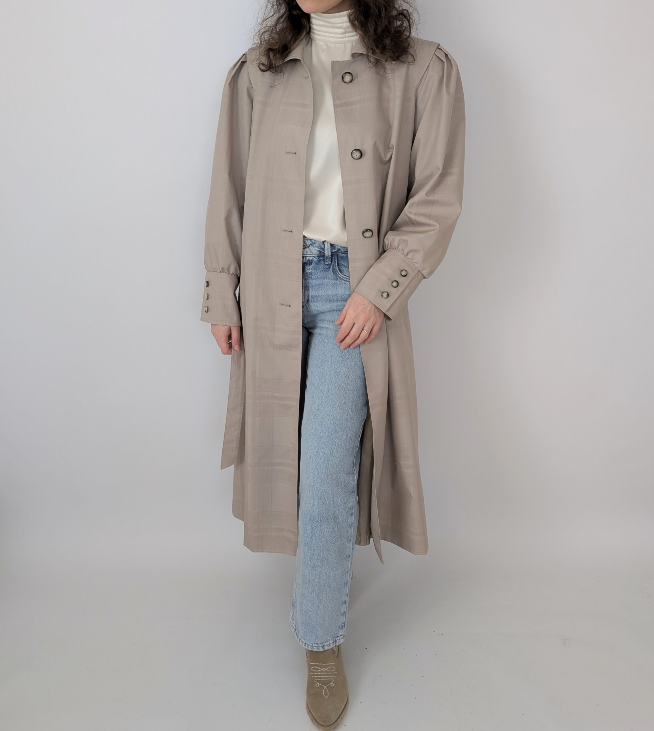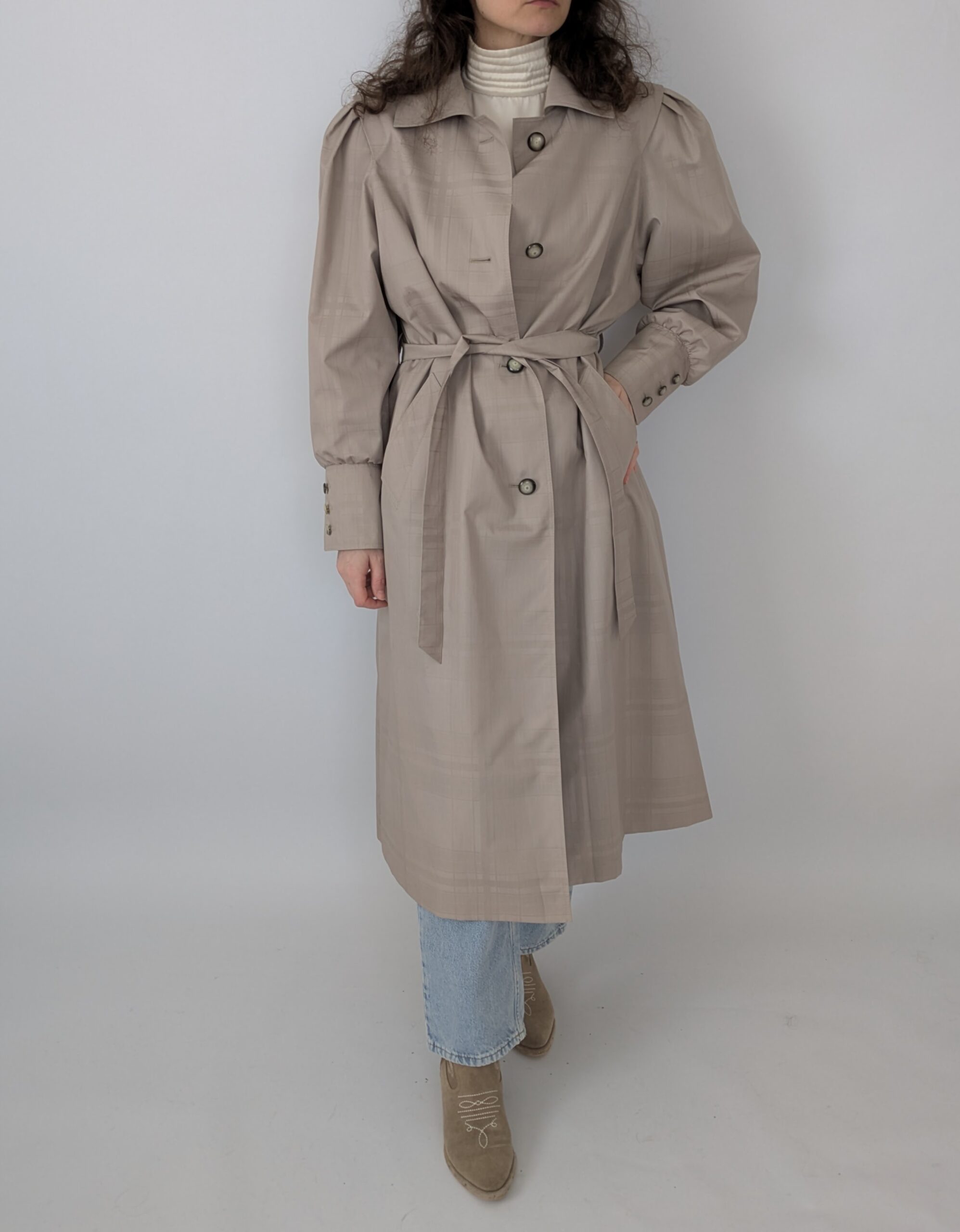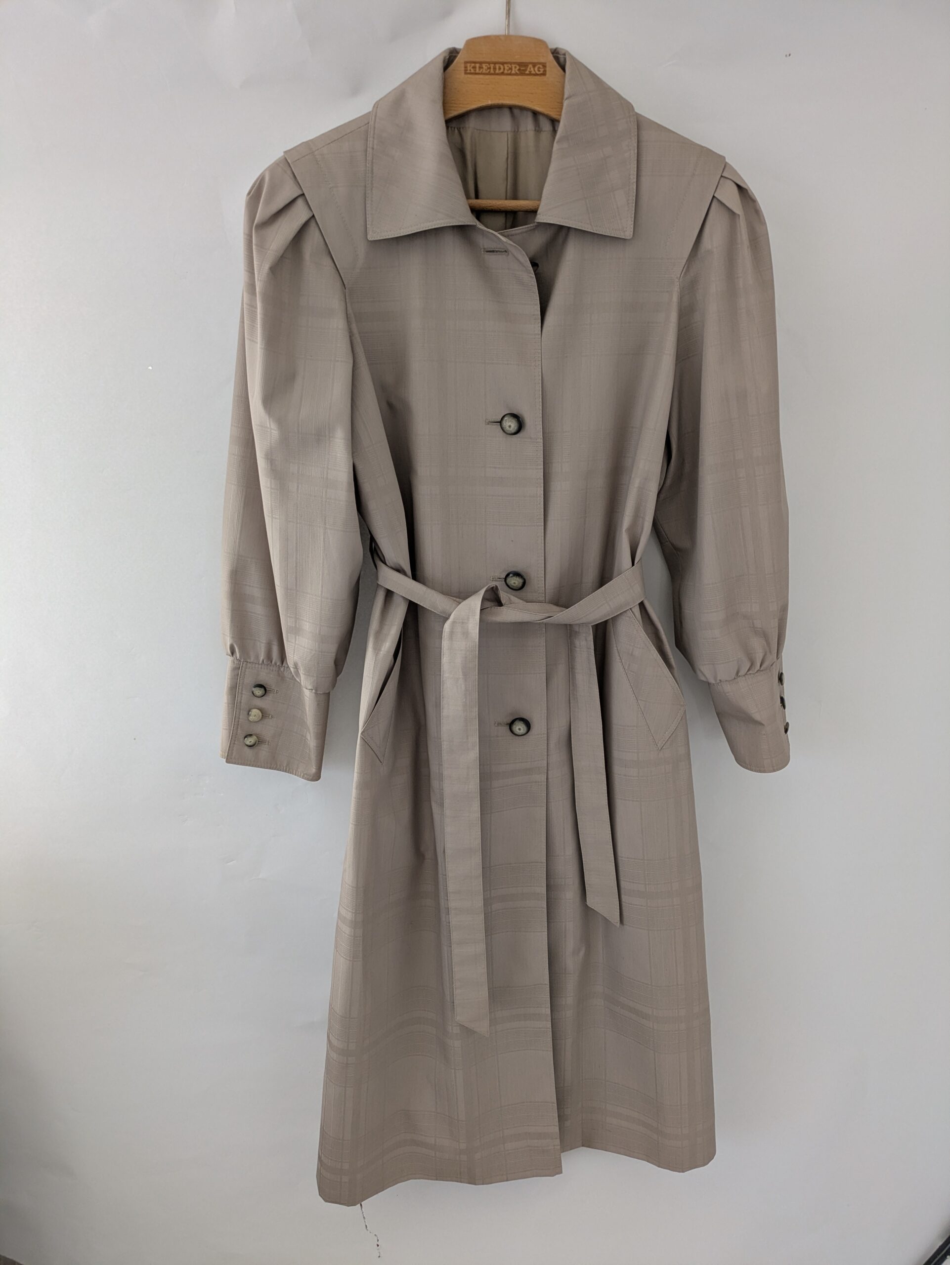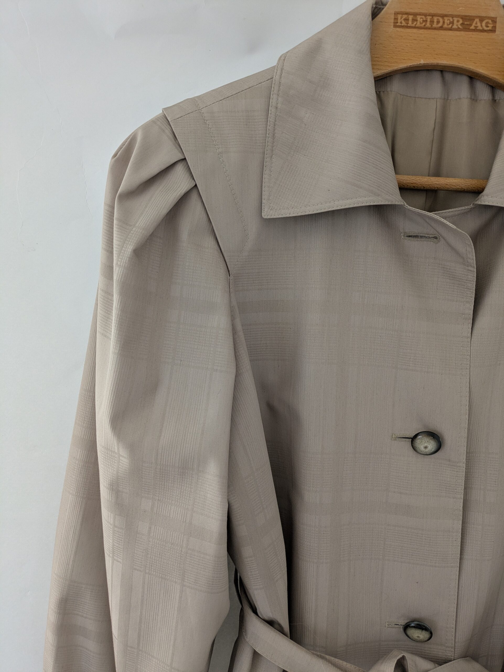 Der Mantel hat Schulterpolster.